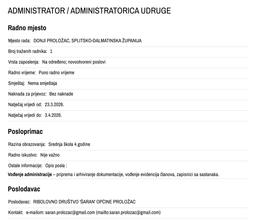 Mjesto rada je Donji Proložac, Splitsko-dalmatinska županija, a zaposlenje se nudi na određeno vrijeme za novootvorene poslove, uz puno radno vrijeme.